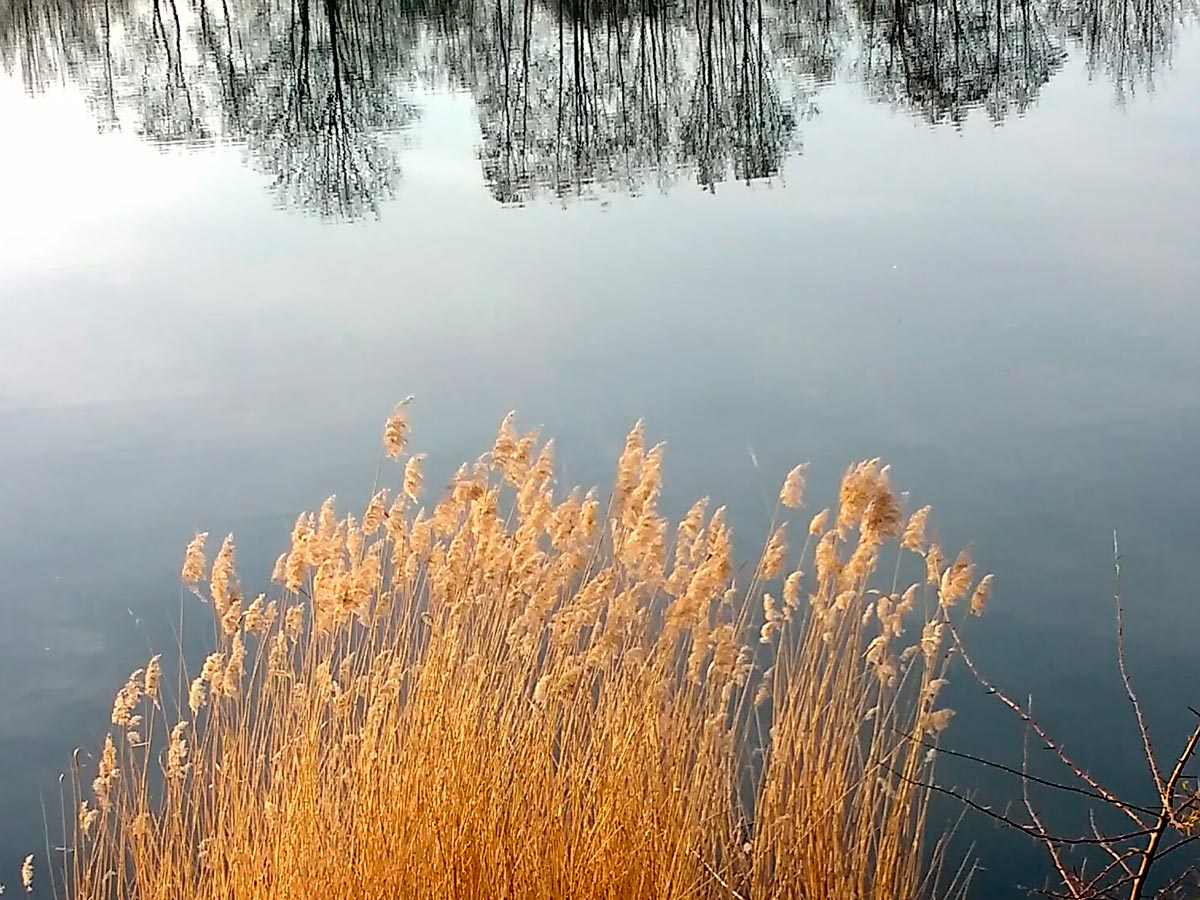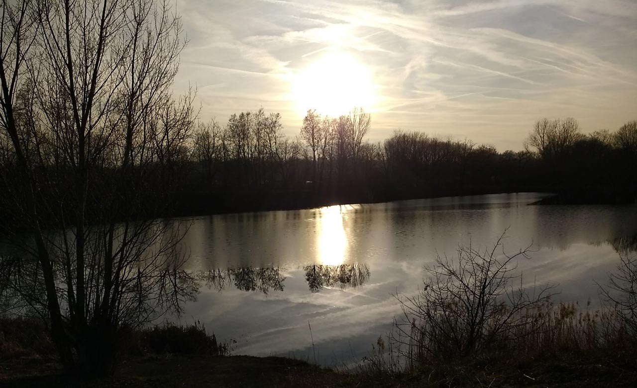 Ich könnte auch wieder einen wunderbaren roten Abendhimmel zeigen. Am Nachmittag war es aber auch sehr schön … Es ist noch ein bisschen Eis auf dem See, dadurch entsteht eine sehr unterschiedliche Spiegelung.